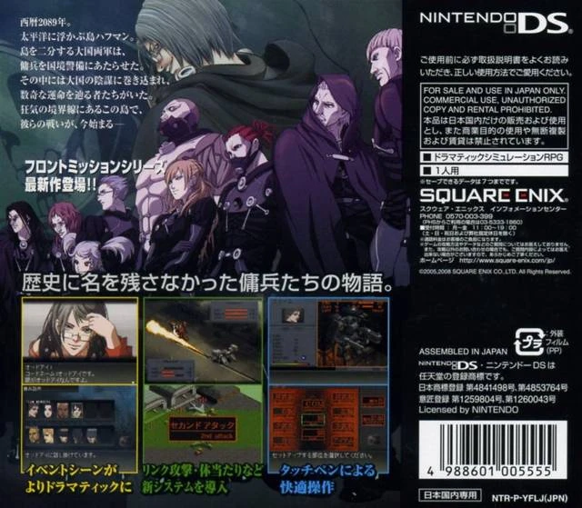 Front Mission 2089 and its sequel, Front Mission 2089-II, serve as the fifth and seventh main entries and the seventh and ninth overall entries in the Front Mission series. They were originally released on mobile phones and later ported to the Nintendo DS as Front Mission 2089: Border of Madness.